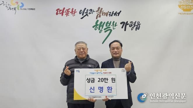 [인천광역신문] 박진 기자 | 가평군 가평읍은 최근 가평읍 지역사회보장협의체 위원으로 활동하는 신명환 위원이 행정복지센터를 방문해 취약계층 이웃돕기 성금 20만 원을 기탁했다고 밝혔다.