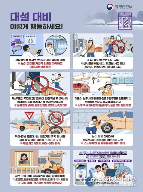 무겁고 많은 눈과 함께 강한 바람으로 붕괴 우려가 있는 주택, 전통시장, 비닐하우스, 축사 등 취약시설은 철저히 점검하고, 위험이 우려될 경우 인명피해 예방을 위해 선제적인 통제 및 주민 대피를 실시하는 한편, 제설작업자에 대한 안전관리도 철저히 해 줄 것을 당부했다.