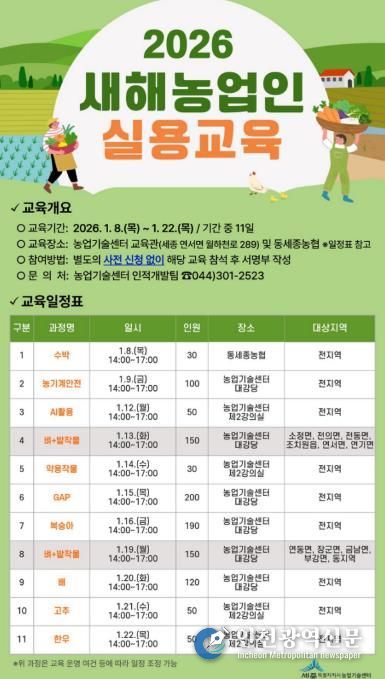[인천광역신문] 박진 기자 | 세종특별자치시 농업기술센터가 오는 22일까지 센터 교육관에서 농업인의 새해 영농설계를 지원하기 위한 실용교육을 운영한다고 밝혔다.