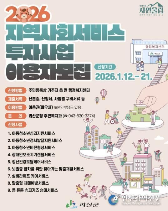 [인천광역신문] 박진 기자 | 충북 괴산군은 오는 12일부터 21일까지 읍·면 행정복지센터에서 2026년 상반기 지역사회서비스투자사업 이용자 모집한다고 9일 밝혔다.
