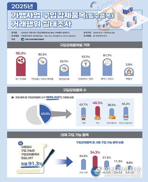 이번 조사는 ▲구입강제품목 거래 현황 ▲구입강제품목 거래에 따른 경영 부담 ▲최근 가맹사업법령 개정 이후 변화 체감 ▲가맹점사업자의 제도 개선 의견을 중점적으로 다루었으며, 그 결과는 다음과 같습니다.