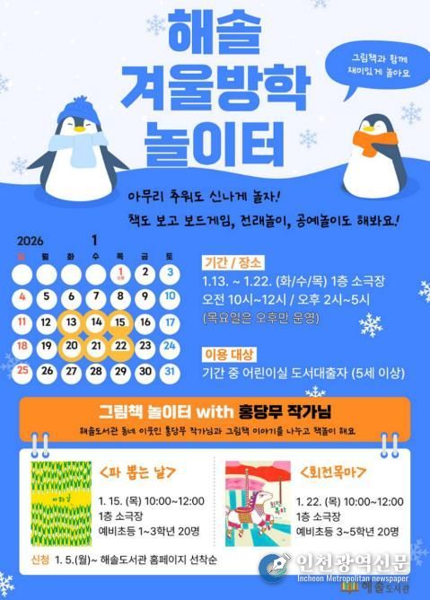 [인천광역신문] 박진 기자 | 파주시 해솔도서관은 겨울방학을 맞이한 어린이들이 한파에도 안전하게 놀 수 있는 ‘해솔 겨울방학 놀이터’를 운영한다.