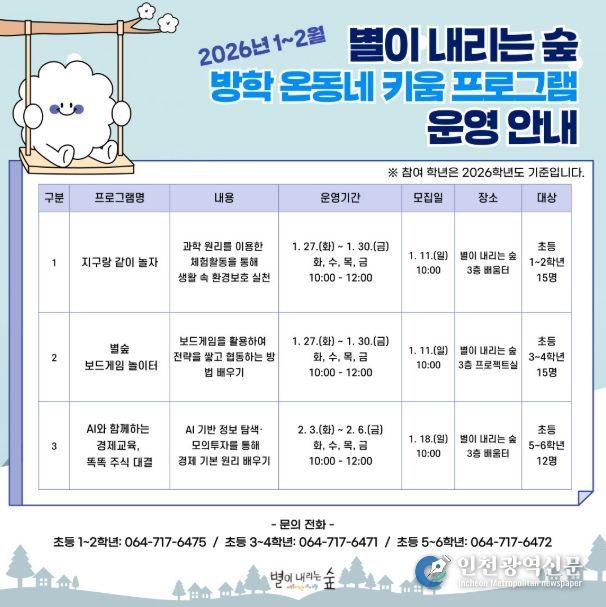 [인천광역신문] 박진 기자 | 제주도교육청 제주도서관은 27일부터 어린이들이 방학 동안 지적 호기심을 충족하고 창의적 인재로 성장할 수 있도록 돕기 위해 겨울방학 특별 프로그램인 ‘2026년 별이 내리는 숲 방학 온동네 키움 프로그램’을 본격 운영한다.