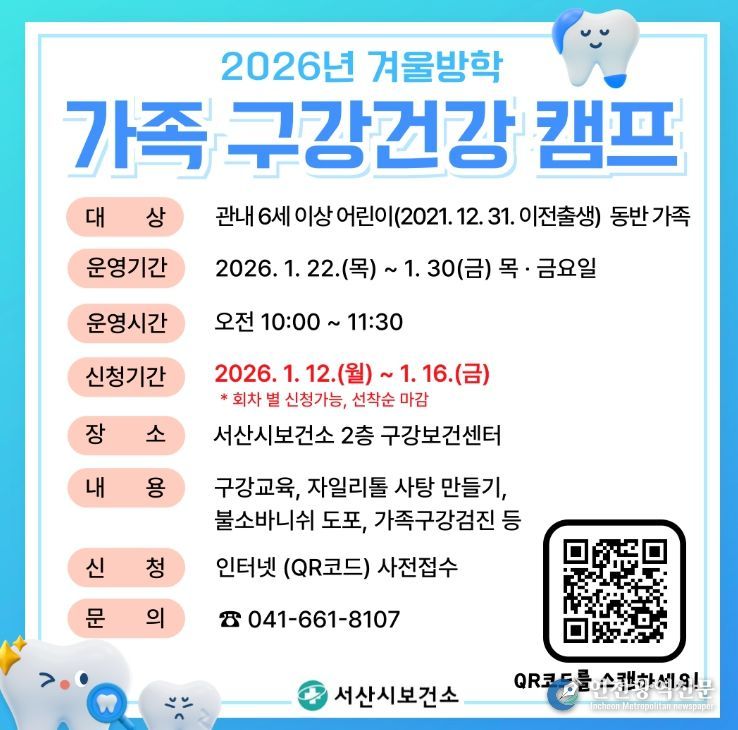 [인천광역신문] 박진 기자 | 충남 서산시가 겨울방학 기간을 맞이하여 '가족 구강건강 캠프'를 운영한다. 기간은 1월 22일부터 30일까지 2주간 목요일과 금요일이며, 총 4회에 걸쳐 진행될 예정이다.