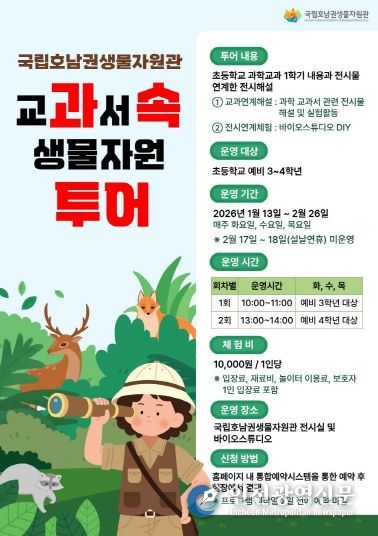 [인천광역신문] 박진 기자 | 기후에너지환경부 산하 국립호남권생물자원관은 겨울방학을 맞이하여 예비 초등학교 3학년부터 4학년을 대상으로 교과서에 나오는 생물을 전시관에서 직접 만나보는 프로그램인 ‘교과서 속 생물자원 투어’를 1월 13일부터 2월 26일까지 운영한다고 밝혔다.