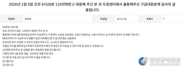 환자의 보호자는 천안서북소방서 칭찬게시판을 통해 “경황이 없는 상황에서 보호자인 제가 차분해질 수 있도록 안정시켜 주시고, 순서 있게 질문해 주셔서 적절한 조치를 할 수 있었다”며 “덕분에 어머니를 빠르게 병원으로 이송해 치료를 받을 수 있었다”고 깊은 감사의 뜻을 전했다.