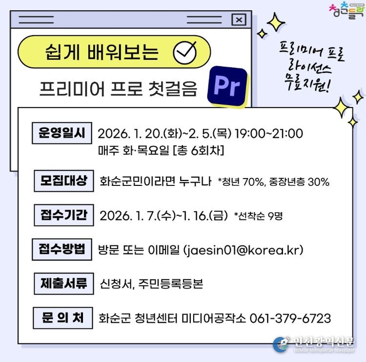 [인천광역신문] 박진 기자 | 화순군은 오는 20일 오후 7시 화순군 청년센터(청춘들락) 미디어공작소에서 화순군민을 대상으로 쉽게 배워보는 프리미어프로 영상 제작 교육을 진행한다고 밝혔다.