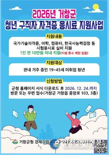 [인천광역신문] 박진 기자 | 거창군은 미취업 청년의 취업 역량 강화와 경제적 부담 완화를 위해 각종 자격증 시험 응시료를 지원한다.