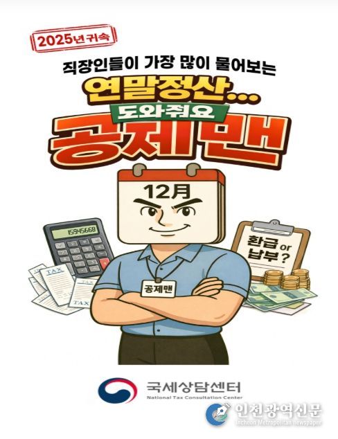 [인천광역신문] 박진 기자 | 국세청은 2025년 귀속 연말정산 시기를 맞아, 인공지능(AI) 기술을 활용해 연말정산 상담사례를 친숙한 캐릭터로 풀어낸 ‘연말정산 도와줘요 공제맨’ 콘텐츠(4컷만화・숏츠영상)를 제공한다.