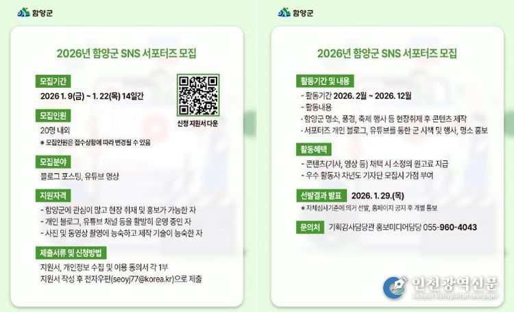[인천광역신문] 박진 기자 | 함양군은 군민의 눈높이에서 소통하며 군의 생생한 현장 소식을 전달할 ‘2026년 함양군 누리소통망(SNS) 서포터즈’를 모집한다고 밝혔다.