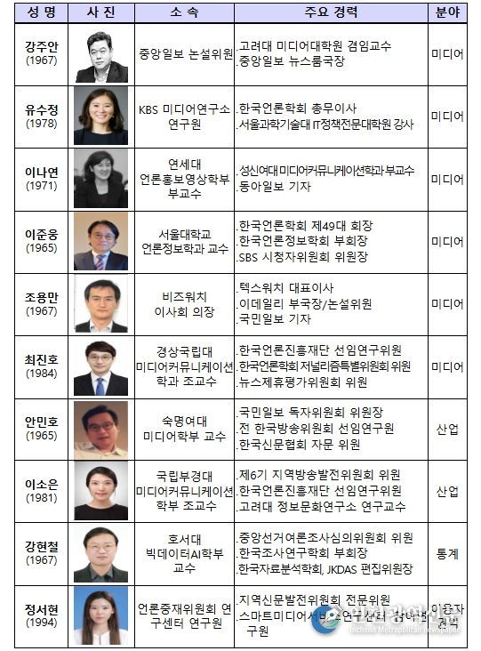 새로 위촉된 위원은 ▴강주안 중앙일보 논설위원, ▴강현철 호서대 빅데이터에이아이(AI)학부 교수, ▴안민호 숙명여대 미디어학부 교수, ▴유수정 케이비에스(KBS) 미디어연구소 연구원, ▴이나연 연세대 언론홍부영상학부 부교수, ▴이소은 국립부경대 미디어커뮤니케이션학부 조교수, ▴이준웅 서울대 언론정보학과 교수, ▴정서현 언론중재위원회 연구원, ▴조용만 비즈워치 이사회 의장, ▴최진호 경상국립대 미디어커뮤니케이션학과 조교수 등으로서, 미디어, 산업, 통계, 이용자권익 분야 등의 전문가로 구성했다.(성명 가나다순)