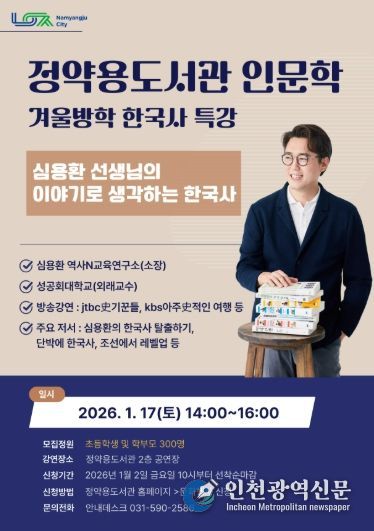 [인천광역신문] 박진 기자 | 남양주시는 오는 17일 오후 2시 정약용도서관 2층 공연장에서 겨울방학 인문학 특강 ‘이야기로 생각하는 한국사’를 개최한다.