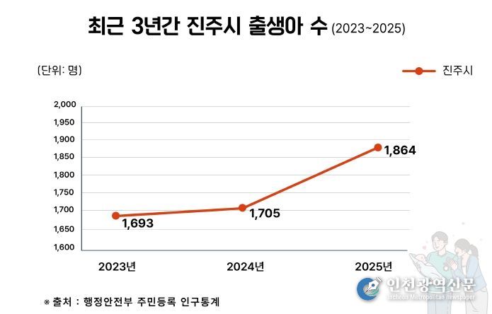 지난 5일 행정안전부의 주민등록 인구통계 발표에 따르면 진주시의 주민등록 출생아 수는 2023년 1693명으로 저점을 찍은 후, 2024년 1705명, 2025년 1864명으로 뚜렷한 증가세를 보였다.