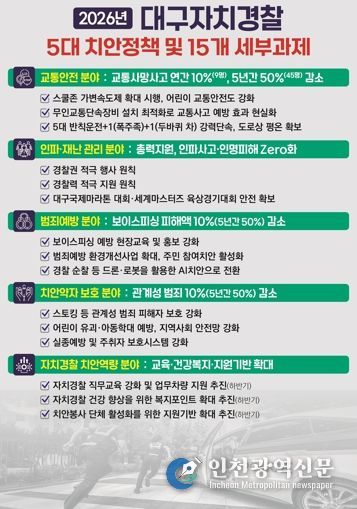 [인천광역신문] 박진 기자 | 대구자치경찰위원회는 2026년을 ‘시민과 함께 만드는 일상안전의 해’로 정하고, 교통안전·인파·범죄예방·치안약자 보호·치안역량 강화 등 5대 정책 분야 및 15개 세부 과제를 추진해 나갈 계획이다.