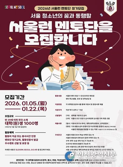 [인천광역신문] 박진 기자 | 서울시는 대학생들이 자신의 지식과 경험을 나누며 장학금 혜택과 취업 역량까지 쌓을 수 있는 ‘서울런 멘토단’ 신규 멘토 1,000명을 22일까지 모집한다.