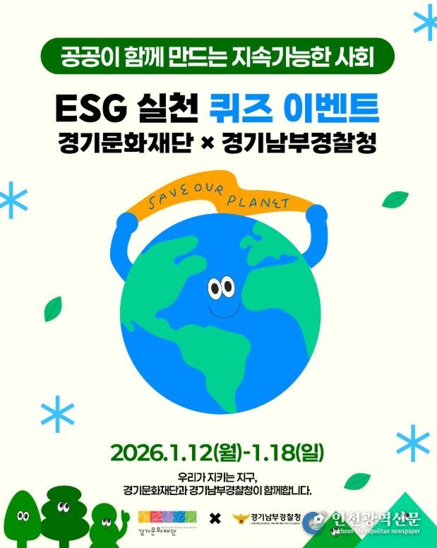 [인천광역신문] 박진 기자 | 경기문화재단(대표 유정주)과 경기남부경찰청이 공공 협업을 통해 ESG 가치 확산에 나선다. 경기문화재단은 경기남부경찰청과 함께 오는 1월 12일부터 1월 18일까지 ‘ESG 실천을 위한 SNS 공동 이벤트’를 진행한다고 밝혔다.