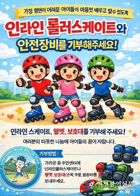[인천광역신문] 박진 기자 | 서울 은평구는 가정형편 등으로 체육활동 참여가 어려운 아동을 지원하기 위해 인라인 롤러스케이트 및 안전장비 기부 캠페인을 연중 운영한다고 밝혔다.