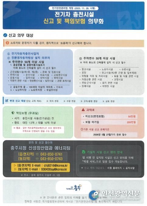 [인천광역신문] 박진 기자 | 충주시는 '전기안전관리법'개정에 따라 전기자동차 충전시설 설치 및 변경 시 지자체에 사전 신고하도록 하는 ‘전기차 충전시설 신고제도’ 를 시행한다고 12일 밝혔다.