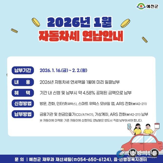 [인천광역신문] 박진 기자 | 예천군은 ‘자동차세 연납 제도’를 2월 2일까지 운영한다고 12일 밝혔다.