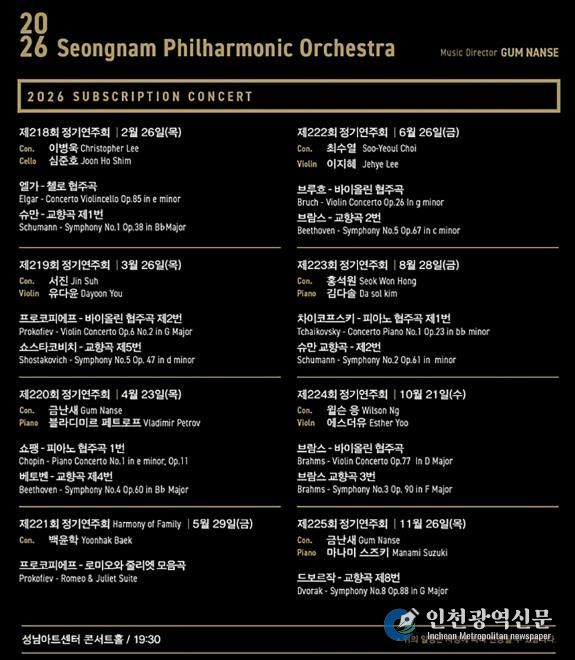 [인천광역신문] 박진 기자 | 2026년 창단 23주년을 맞는 성남시립교향악단은 해마다 다양한 연주자와 수준높은 프로그램으로 끊임없이 매진 행렬을 이어가고 있다.