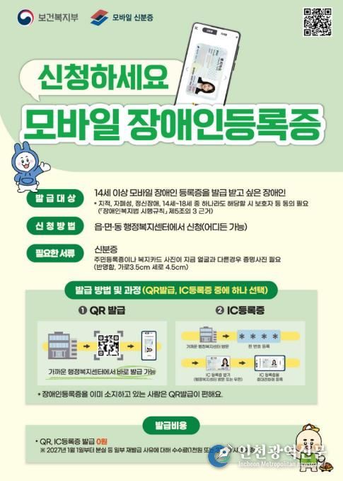 [인천광역신문] 박진 기자 | 서울 동대문구는 보건복지부 지침에 따라 ‘모바일 장애인등록증 발급 서비스’를 22일부터 본격 시행한다고 밝혔다. 기존 플라스틱 형태의 장애인등록증을 스마트폰에 저장해 사용할 수 있도록 해, 휴대성과 편의성을 높인 것이 핵심이다.