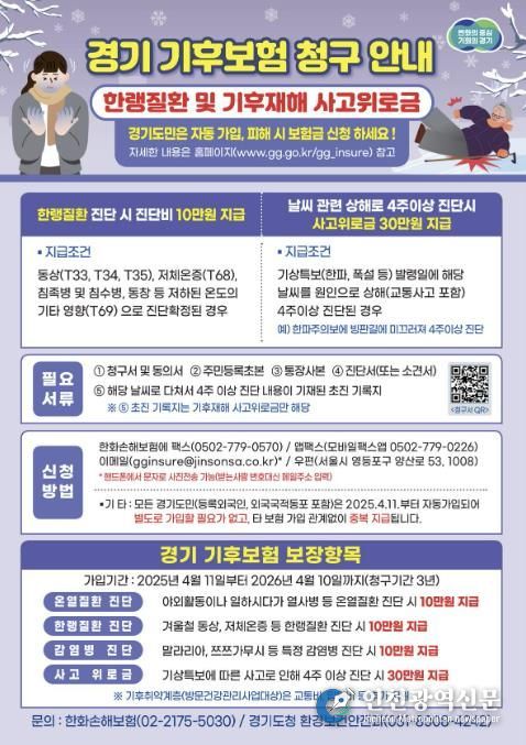 한편 ‘경기 기후보험’은 한랭질환 외에도 여름철 온열질환이나 말라리아, 쯔쯔가무시와 같은 특정 감염병 진단 시에도 각각 10만 원의 진단비를 지원한다. 상세한 문의는 한화손해보험(02-2175-5030)을 통해 가능하다.
