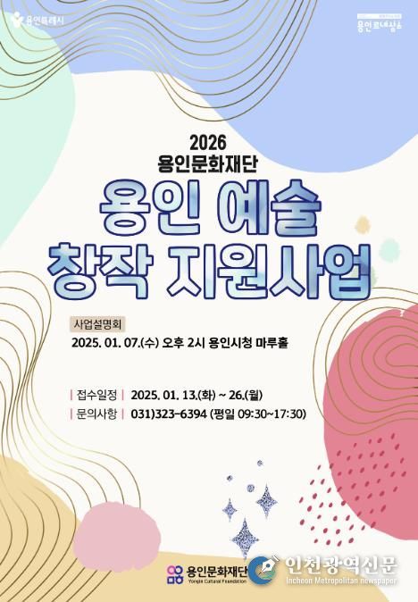 [인천광역신문] 박진 기자 | 용인문화재단은 기존'문화 예술 공모 지원사업'을 전면 개편하고, 사업명을 ‘2026 용인 예술 창작 지원’으로 변경해 새롭게 전환한다고 밝혔다. 이번 사업은 지난 6일 공고됐으며, 1월 13일부터 26일까지 접수를 통해 총 6억 400만 원의 지원금을 사업 유형과 규모에 따라 차등 지원할 예정이다.