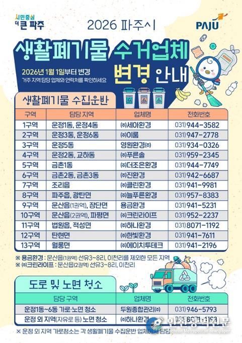 [인천광역신문] 박진 기자 | 파주시는 2026년 1월 1일부터 관내 생활폐기물(쓰레기) 수집·운반 대행업체가 변경됨에 따라, 시민에게 정확한 정보를 안내하고 현장 운영이 원활히 정착될 수 있도록 홍보와 안내를 강화하고 있다고 밝혔다.