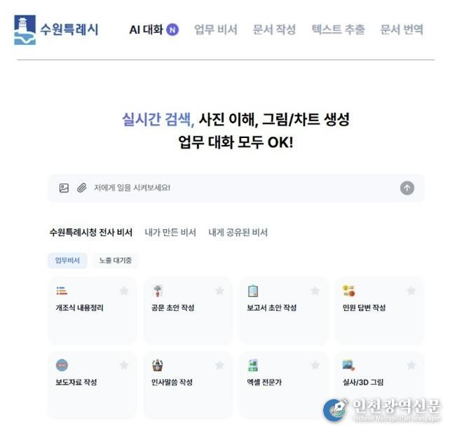 [인천광역신문] 박진 기자 | 수원특례시가 생성형 인공지능(AI)을 행정 전반에 활용하기 위해 12일 공직자를 대상으로 ‘수원 인공지능(AI) 업무 비서’ 서비스를 개시했다.