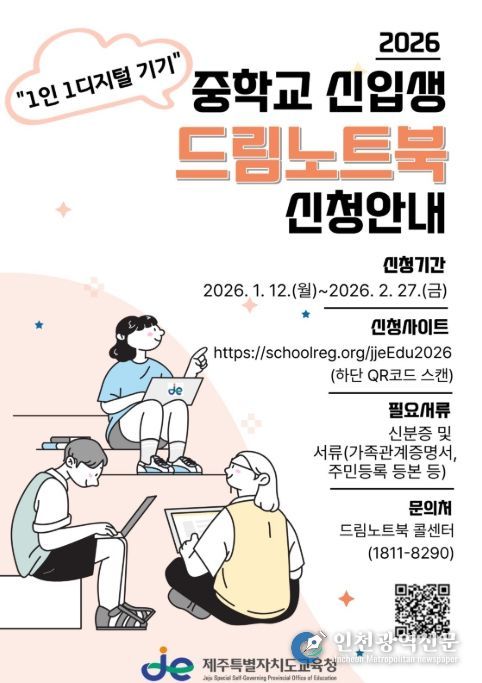 [인천광역신문] 박진 기자 | 제주특별자치도교육청은 12일부터 인공지능(AI) 대전환 시대를 맞아 도내 학생들의 디지털 학습 역량을 강화하기 위해 중학교 신입생을 대상으로 ‘2026학년도 드림노트북 지원(대여) 사업’ 신청을 받는다.