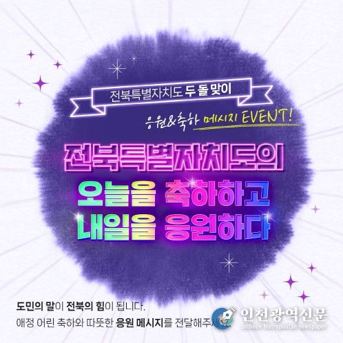 [인천광역신문] 박진 기자 | 전북특별자치도는 출범 2주년을 맞아 도민이 직접 참여하는 '도민 참여 축하·응원 메시지 이벤트'를 1월 12일부터 23일까지 운영한다.