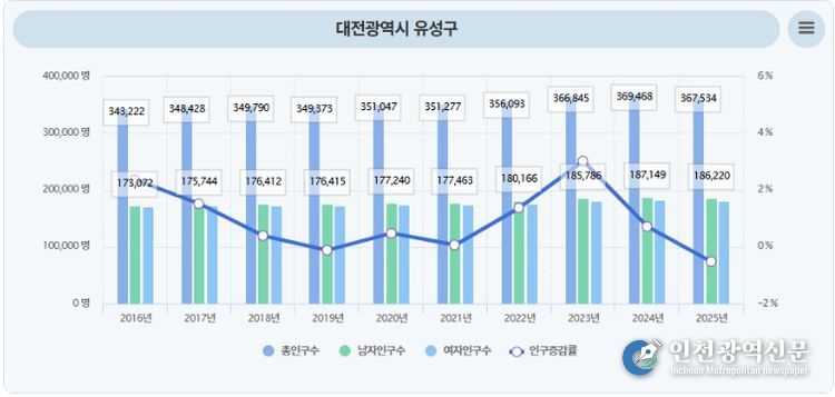 [인천광역신문] 박진 기자 | 대전 유성구가 전국적인 인구 감소와 지방 소멸 위기 속에서도, 최근 10년간 대전에서 유일하게 인구가 늘어난 것으로 나타났다.