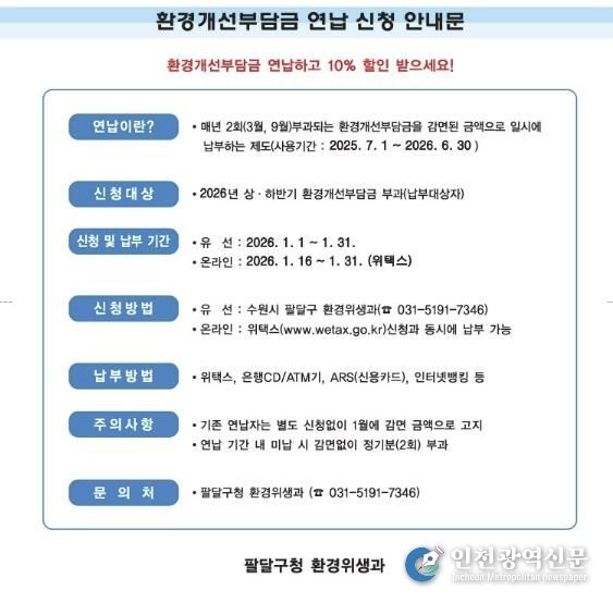 [인천광역신문] 박진 기자 | 수원시 팔달구는 환경개선부담금 납부 대상자를 대상으로 1월 31일까지 환경개선부담금 연납 신청을 받는다.