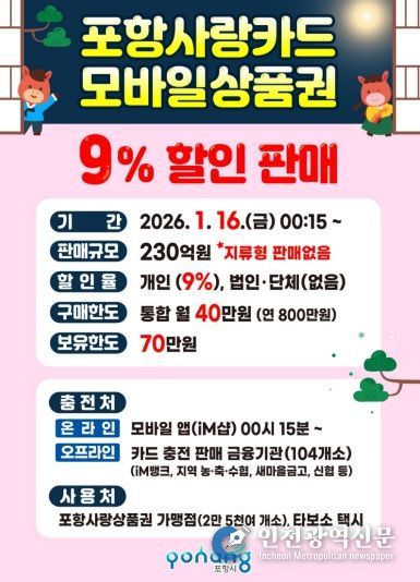 [인천광역신문] 박진 기자 | 포항시는 오는 16일부터 2026년 카드형·모바일 포항사랑상품권(이하 포항사랑카드)의 첫 할인판매를 시작한다.