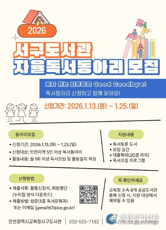 [인천광역신문] 박진 기자 | 인천광역시교육청서구도서관은 지역 주민들이 책으로 소통하며 함께 성장하는 즐거움을 나누는 ‘2026년 자율 독서동아리’를 13일부터 25일까지 모집한다.