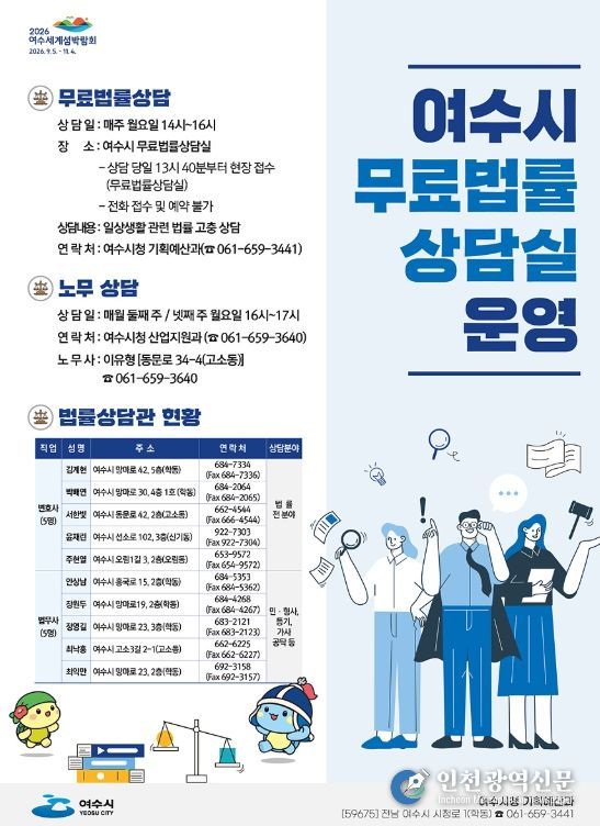 [인천광역신문] 박진 기자 | 여수시가 이달 1월부터 일상생활에서 법률문제로 어려움을 겪거나 피해를 본 시민에게 ‘무료 법률 상담’을 제공한다.