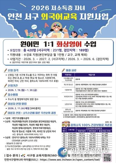 [인천광역신문] 박진 기자 | 인천 서구는 저소득층 자녀에게 양질의 외국어 교육을 지원함으로써 교육 기회의 형평성을 제고하고 글로벌 시대에 걸맞는 인재로 성장할 수 있는 기반을 마련하고자 관내 저소득층 자녀를 위한 외국어교육 지원 사업을 3월부터 시행한다.
