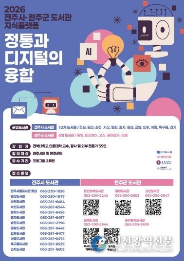 전주시는 지난 8일부터 오는 2월 5일까지 12개 시립도서관에서 전북대학교와 연계한 ‘전주시 도서관 지식플랫폼: 정통과 디지털의 융합’ 프로그램을 운영한다고 12일 밝혔다.