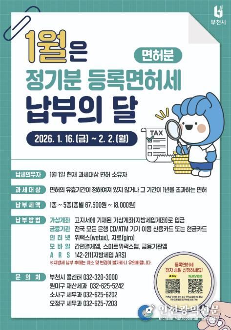 [인천광역신문] 박진 기자 | 부천시는 2026년 1월 정기분 등록면허세(면허분) 9만 1천 건, 30억 원을 부과했다고 12일 밝혔다.