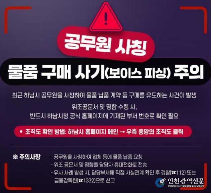 [인천광역신문] 박진 기자 | 하남시는 최근 공무원을 사칭하여 관내 중소기업과 소상공인, 시민들을 대상으로 한 범죄 사례가 지속적으로 발생함에 따라 각별한 주의가 필요하다고 밝혔다.