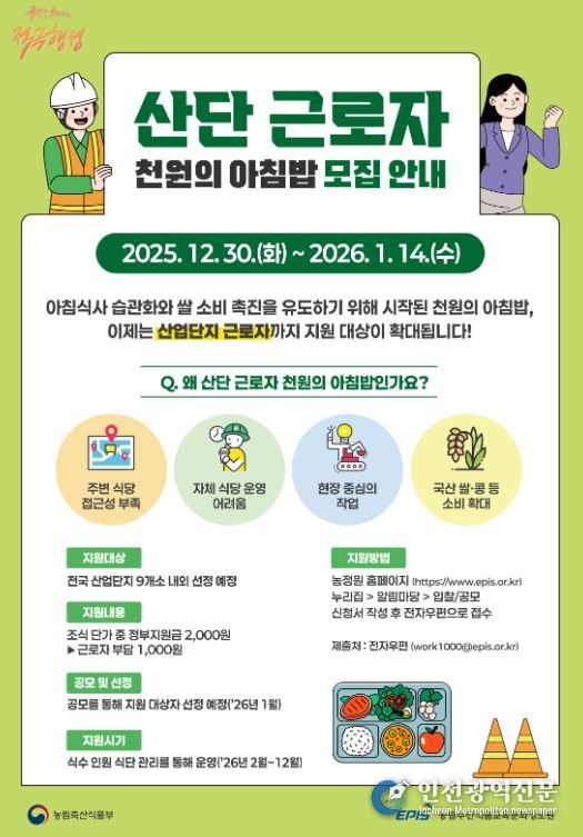 [인천광역신문] 박진 기자 | 전라남도는 올해 중소기업 근로자에게 ‘천원의 아침밥’ 또는 ‘든든한 점심밥’ 사업을 지원한다.