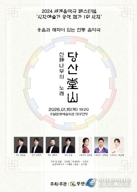 [인천광역신문] 박진 기자 | 무안군은 세계음악극페스티벌에서 신진예술가 부문 1위로 선정된 전통음악극 ‘당산’을 오는 1월 15일 오후 7시 20분, 승달문화예술회관 대공연장에서 선보인다고 밝혔다.
