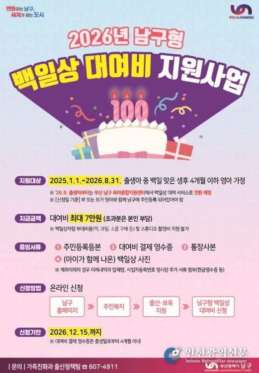 [인천광역신문] 박진 기자 | 부산 남구가 소중한 아이의 백일을 뜻깊게 기념할 수 있도록 '2026년 남구형 백일상 대여비 지원사업'을 추진한다고 밝혔다.