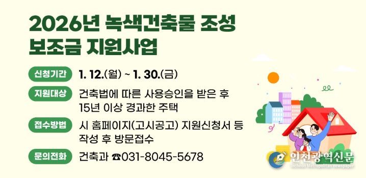 [인천광역신문] 박진 기자 | 안양시는 높은 에너지 효율 달성 및 온실가스 배출 저감을 위해 노후한 건축물의 보수공사 비용을 지원하는 ‘2026년 녹색건축물 조성 보조금 지원사업’을 추진한다고 12일 밝혔다.