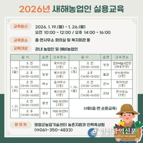 [인천광역신문] 박진 기자 | 영광군은 오는 1월 19일부터 26일까지 각 읍·면에서 농업인 1,800명을 대상으로 “2026년 새해 농업인 실용교육”을 실시한다고 밝혔다.