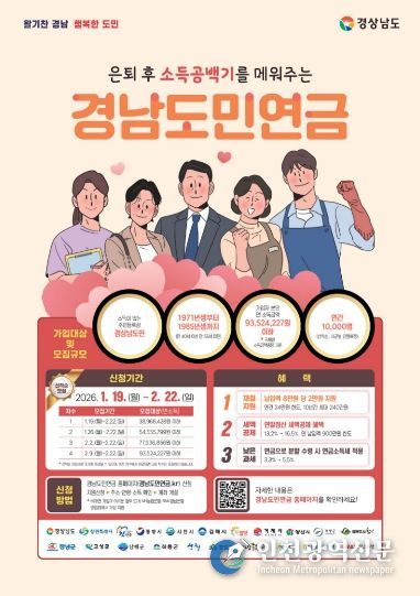 [인천광역신문] 박진 기자 | 양산시는 은퇴 후 국민연금 수령 전까지의 소득 공백기 해소와 안정적인 노후 준비를 지원하기 위한 '경남도민연금'가입자 모집을 1월 19일부터 시작한다고 밝혔다.