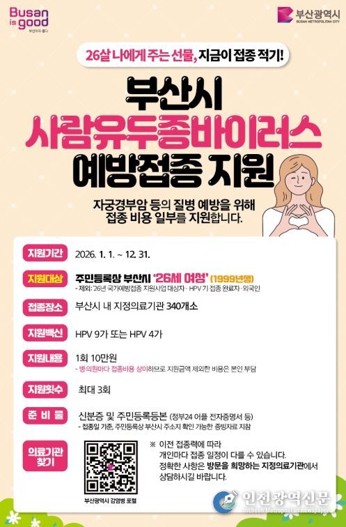 [인천광역신문] 박진 기자 | 영도구보건소는 사람유두종바이러스(HPV) 감염으로 인한 자궁경부암 등 주요 질환을 예방하기 위해 2026년 26세 여성을 대상으로 사람유두종바이러스(HPV) 예방접종 비용 일부를 지원하는 사업을 시행한다.