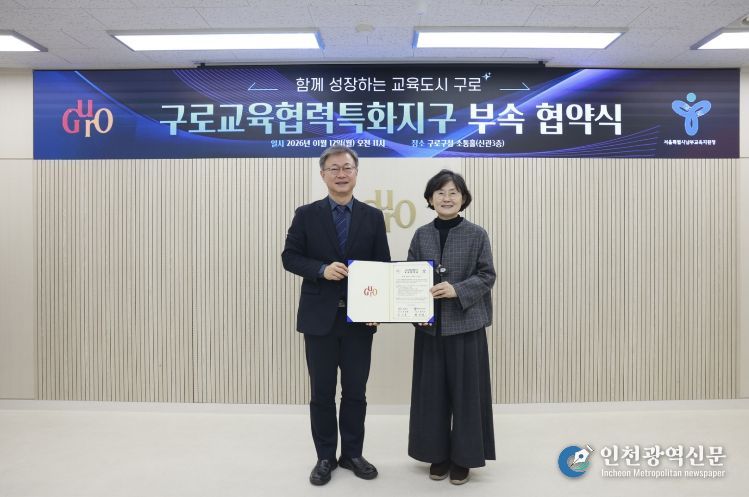 [인천광역신문] 박진 기자 | 구로구가 1월 12일 구청 소통홀에서 서울특별시남부교육지원청과 ‘구로교육협력특화지구 부속 합의 협약식’을 열고, 학생맞춤통합지원 협력사업을 포함한 구로교육특화지구 교육협력 사업 추진을 위한 부속합의를 체결했다.