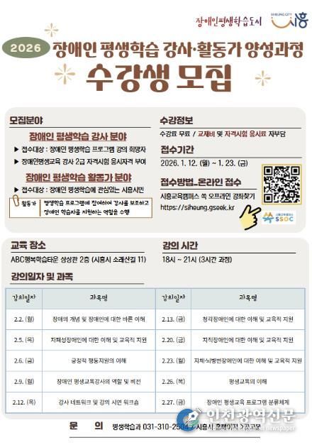 [인천광역신문] 박진 기자 | 시흥시는 오는 1월 23일까지 ‘2026년 장애인 평생학습 전문 강사와 활동가 양성 과정’ 수강생을 모집한다.