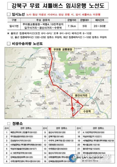 비상수송대책의 핵심으로, 구는 ‘임시 무료 셔틀버스(임시 1번)’를 운영하고 있다. 셔틀버스는 우이동 교통광장에서 수유역까지 약 7.5km 구간을 운행하며, 전세버스 10대가 투입돼 오전 6시부터 밤 10시까지 운행된다.